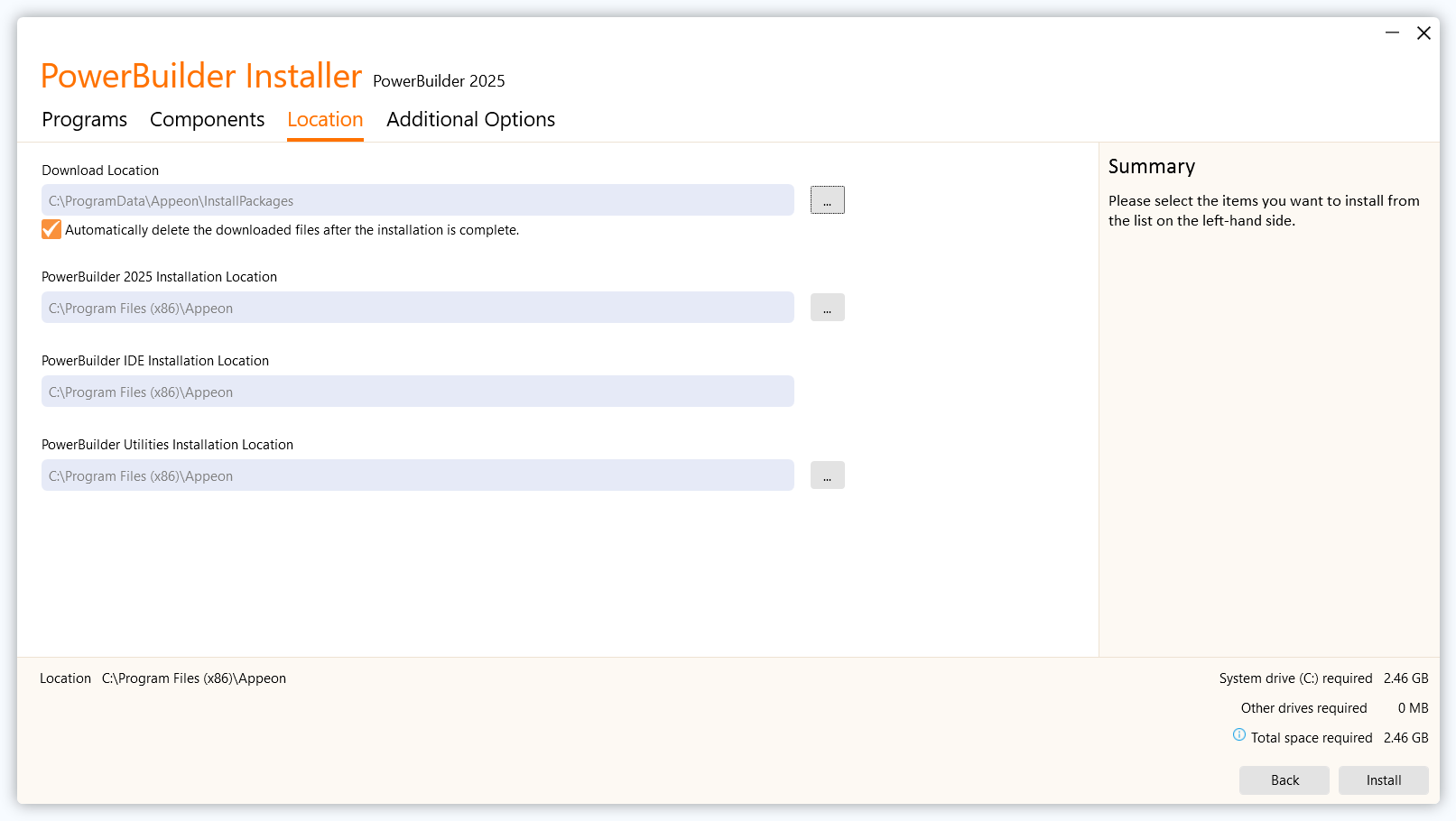 Based on the program(s) you selected, the available components will be shown in the Components tab. Select the components you want to install.