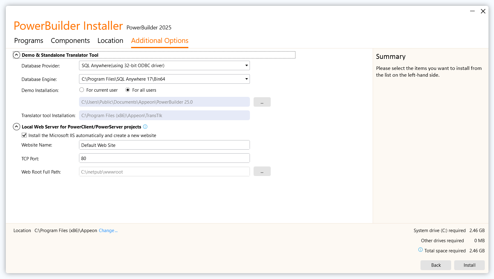 In the Additional Options tab, specify a database engine for running the PowerBuilder demo database and set up the local web server.