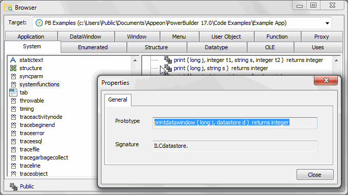 For example, to obtain the signature of a system function, select systemfunctions from the left pane of the System page, right-click the function in the right pane, and select Properties from its pop-up menu: