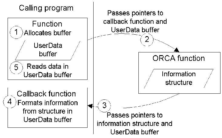 When the ORCA function needs to report information, it calls the callback function. It passes pointers to the structure holding the information and the UserData buffer.