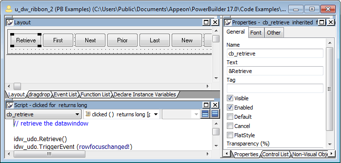 In this User Object painter for a custom visual user object, the Layout view and Script editor have been arranged to display at the same time: