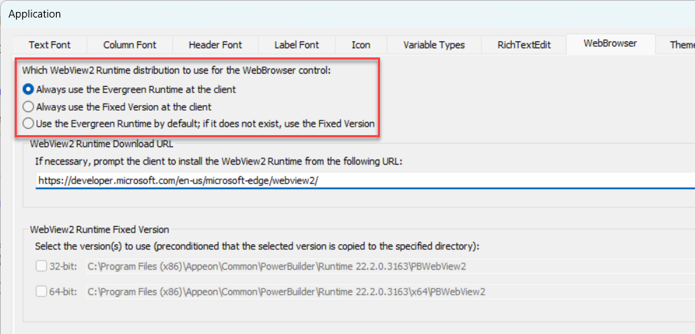 When this option is selected, you will need to manually download and install the Fixed Version of the WebView2 Runtime (from https://developer.microsoft.com/en-us/microsoft-edge/webview2/) to the location shown in the "WebView2 Runtime Fixed Version" group, normally %systemdrive%\Program Files (x86)\Appeon\Common\PowerBuilder\Runtime [version]\PBWebView2.