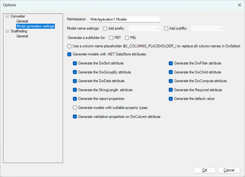 For example, if you add {pbt} as prefix and {pbl} as suffix, the model class whose DataWindow is "d_Example_Report_Detail" may have a name like "Pb_Examplesd_Example_Report_Detailpbexamsa".