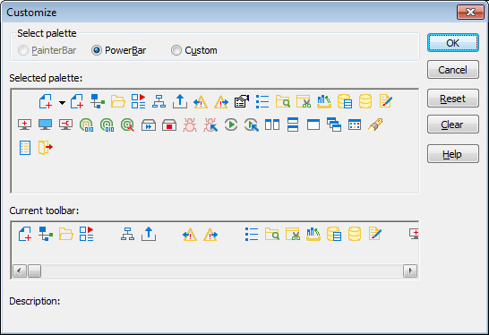 For information about creating new toolbars and about the meaning of PowerBar1, see Creating new toolbars.