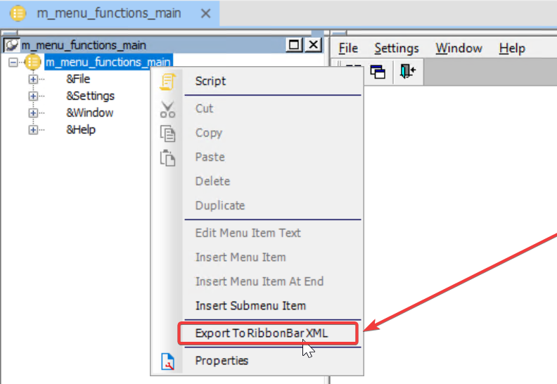 If you right-click the top-level menu object and then select Export to RibbonBar XML, the entire menu will be exported as a ribbon bar in the XML format.