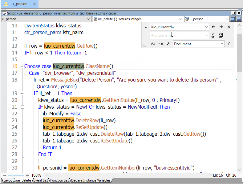The editor allows you to find and replace text by using the Find and Replace dialog (Ctrl+F or Ctrl+H).