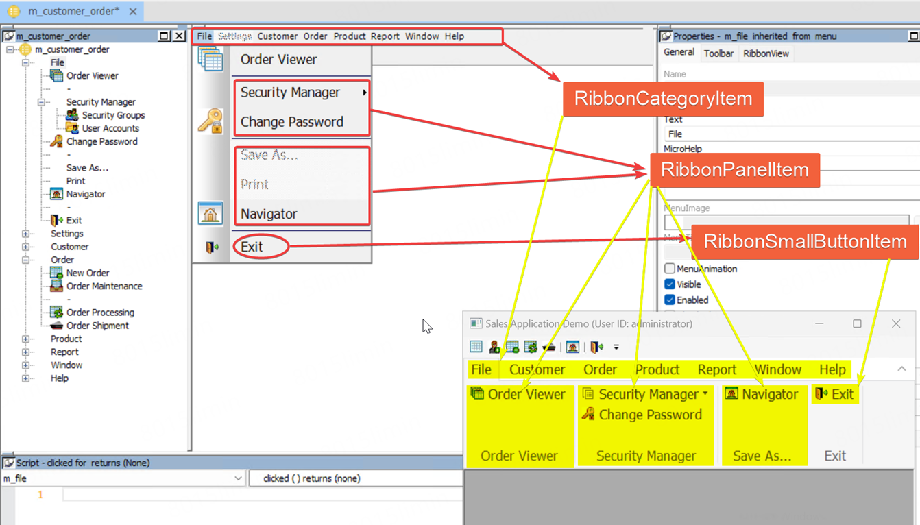 And the properties, functions, and events of the menu item are automatically mapped and bound to the corresponding standard ribbon item control.