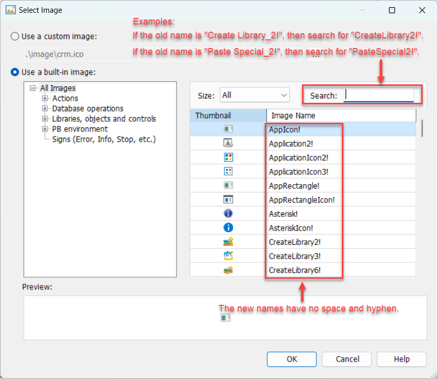 Cause: The naming conventions for internal system icons in PowerBuilder 2017 were inconsistent -- some names included spaces and hyphens while others did not. In PowerBuilder 2019 R2 (build 2323) and later, these icons were renamed to a standardized format, removing spaces and hyphens. Consequently, the original names cannot be found in the Select Image dialog any more. However, although the original names cannot be located, they remain compatible and visible when used in the application; the only exception is the RibbonView.