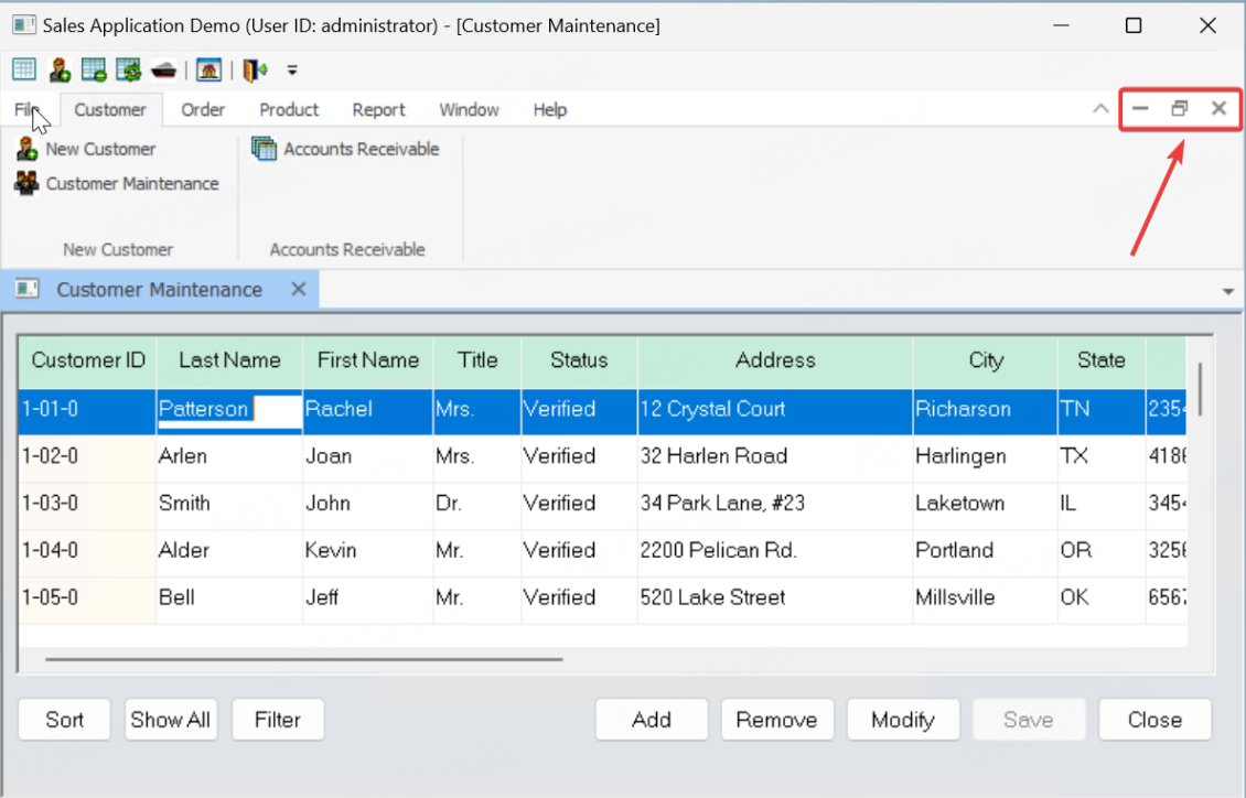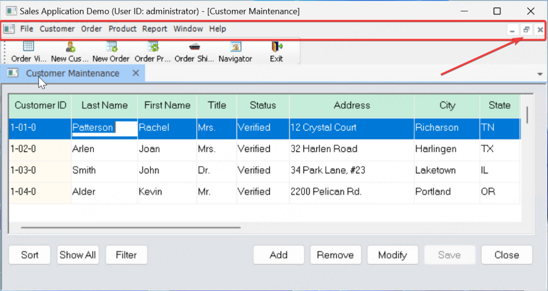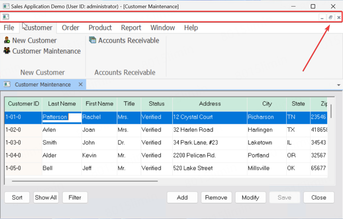 FYI. If you use the RibbonBar standalone control to redesign the menu and use the same type of sheet window (Main type, with ControlMenu, Maximize, and Minimize enabled), the title bar will be as shown below.