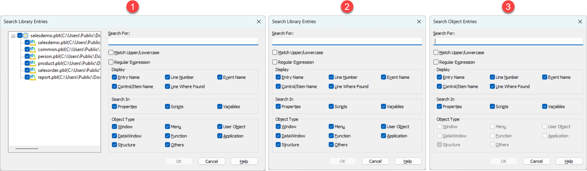 In the Object Type group box, select the object type in which you want to search: Window, Menu, User Object, DataWindow, Function, Application, Structure, and Others (including pipeline, project, query etc.) .