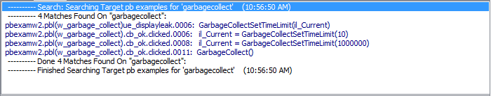 PowerBuilder searches the libraries for matching entries. When the search is complete, PowerBuilder displays the matching entries in the Output window.