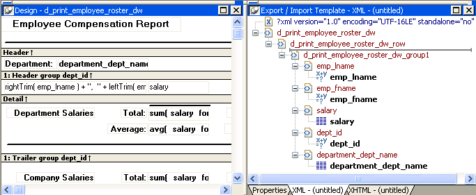 You define and edit templates for export and import in the Export/Import Template view for XML in the DataWindow painter. The view uses a tree view to represent the template.