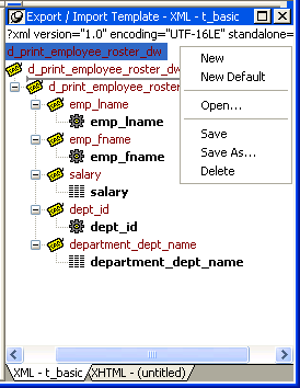 From the pop-up menu for the Export/Import Template view (with nothing selected), you can create new templates with or without default contents, open an existing template, save the current template, or delete the current template. You can only open and edit templates that are associated with the current DataWindow object.