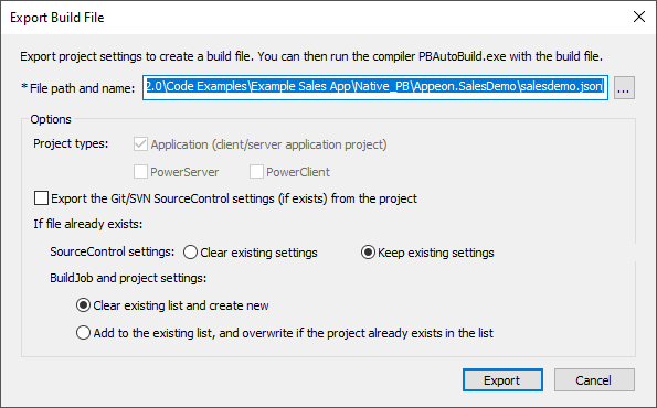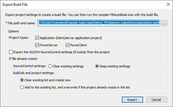 The exported build file contains all the settings required for building and deploying the PBL of the Example Sales App and some additional settings: