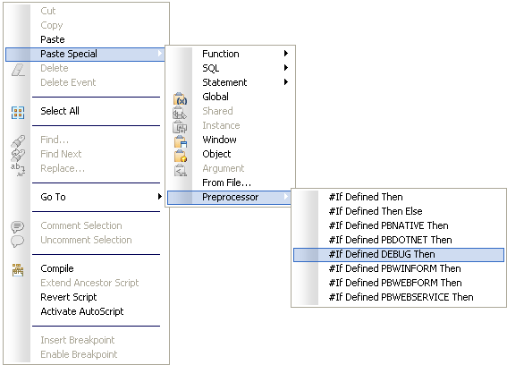 You can use the syntax #IF DEFINED followed by a predefined preprocessor symbol to mark a block of code for specialized processing before it is compiled. The block of conditional code is automatically parsed by a PowerBuilder preprocessor before it is passed to the compiler. Most of the predefined preprocessor symbols are used only for .NET targets, but the DEBUG symbol can be used in standard PowerBuilder targets as well.