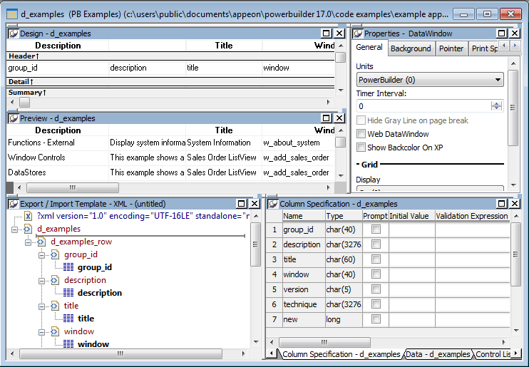 The Export/Import Template view for XML at the bottom left shows a default template for exporting and importing data in XML format. You can define custom templates for import and export. The templates are saved with the DataWindow object. For more information, see Exporting and Importing XML Data.