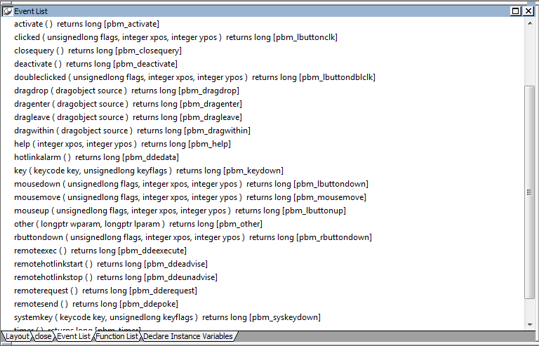 PowerBuilder has its own events, each of which has an event ID. For example, the PowerBuilder event DragDrop has the event ID pbm_dragdrop. The event name and event ID of the predefined PowerBuilder events are protected; they cannot be modified. The event IDs for predefined events are shown in the Event List view: