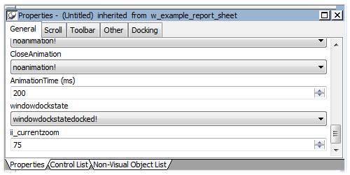 If you create a window by inheriting it from an existing window that has public or protected instance variables with simple datatypes, the instance variables display and can be modified in the descendant window's Properties view. You see them at the bottom of the General tab page. In this illustration, the last property is an inherited instance variable.
