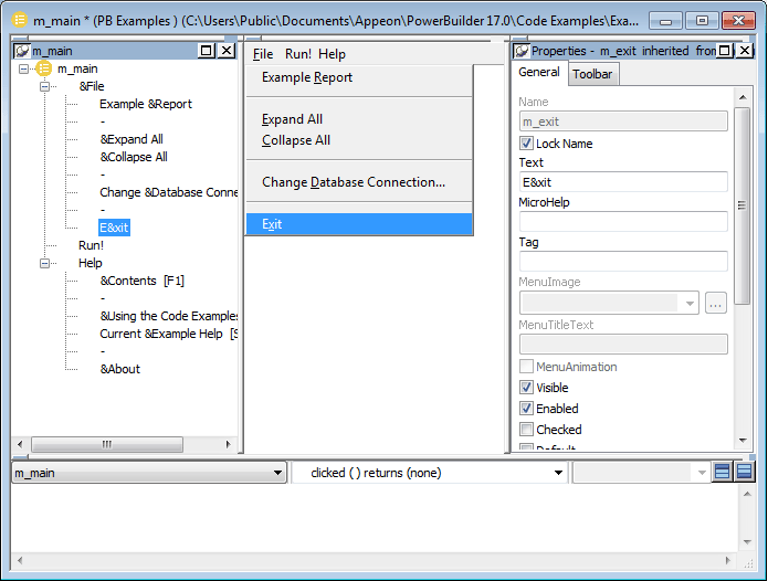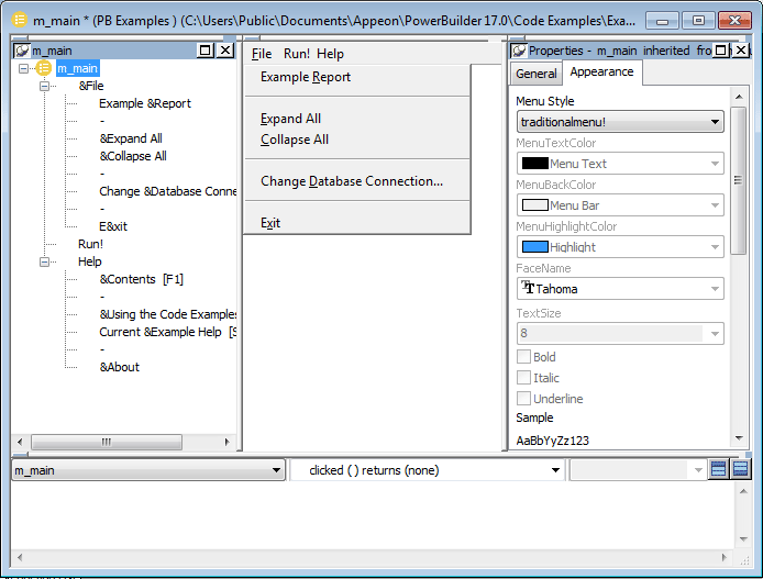 This Menu painter layout is for the top level menu object, m_main. The Tree Menu view is in the top left and the WYSIWYG Menu view is in the top middle. The General and Appearance tab pages display in the Properties view on the right. For more information about these properties, see Setting menu style properties for contemporary menus.