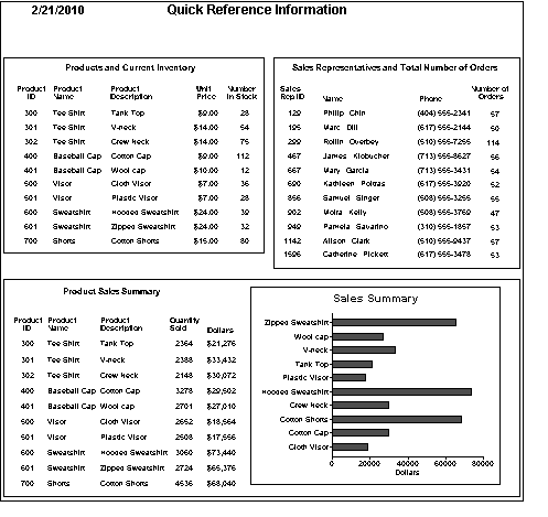 For example, the following freeform report lists all information about a customer and then includes a related nested report (which happens to be a tabular report). The related nested report lists every order that the customer has ever placed. The base report supplies the customer ID to the nested report, which requires a customer ID as a retrieval argument. This is an example of a master/detail relationship—one customer has many orders: