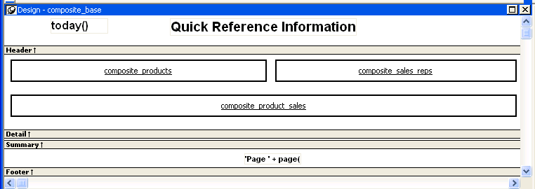 In the Design view, you see three boxes that represent the individual tabular reports that are included in the composite report. The only additional controls in this example are a title, date, and page number: