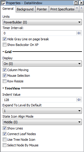 The properties that are specific to a TreeView DataWindow are the TreeView properties and the Grid properties. The grid-related properties display only if you select the Grid Style check box when you define the TreeView DataWindow.