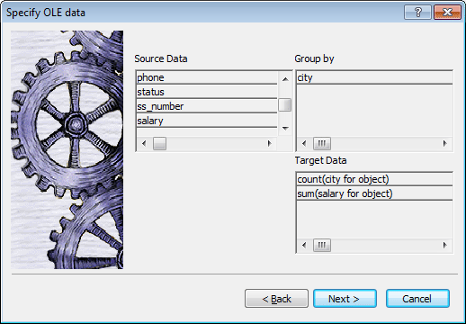 You can drag the columns you want the OLE object to use to the Target Data box. You can also control the grouping of data and edit the expression for a column. If necessary, you can change these specifications later.