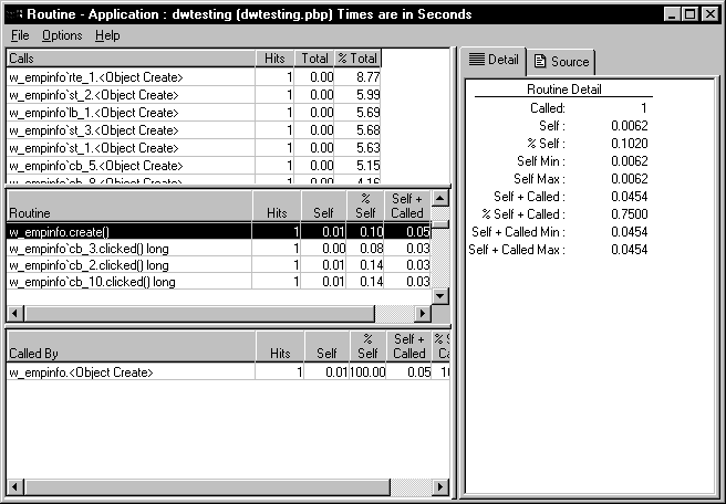 The middle DataWindow and the DataWindow on the right highlight the current routine and show detailed statistics.