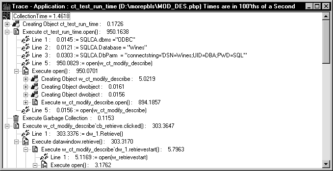The Trace view uses the trace tree model to show the sequence of execution. It includes statistics and (for those routines that originated in PowerScript source) source code.