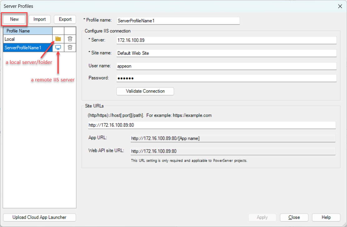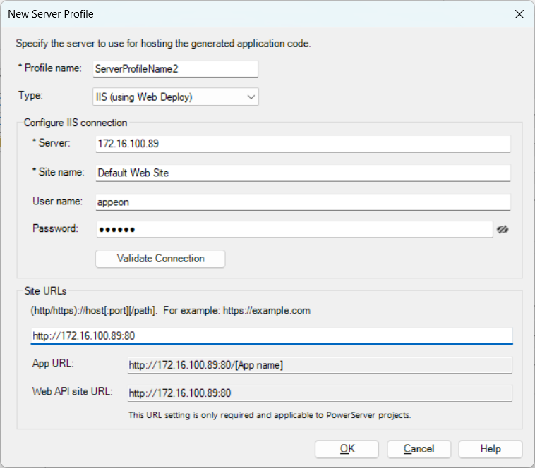 You can select this server profile later (in the PowerServer project painter > Deploy > Basic tab > IIS target server), and then configure the host name, port number, and connection method. These settings will be used to generate the application URL when you run the app within the IDE.