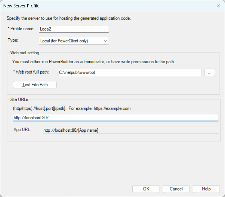 In the New Server Profile window, modify the profile name as needed, select Local (for PowerClient only) from the Type list, and then specify the Web root of the Web server (for example %systemdrive%\inetpub\wwwroot for IIS) or a subdirectory under the Web root.