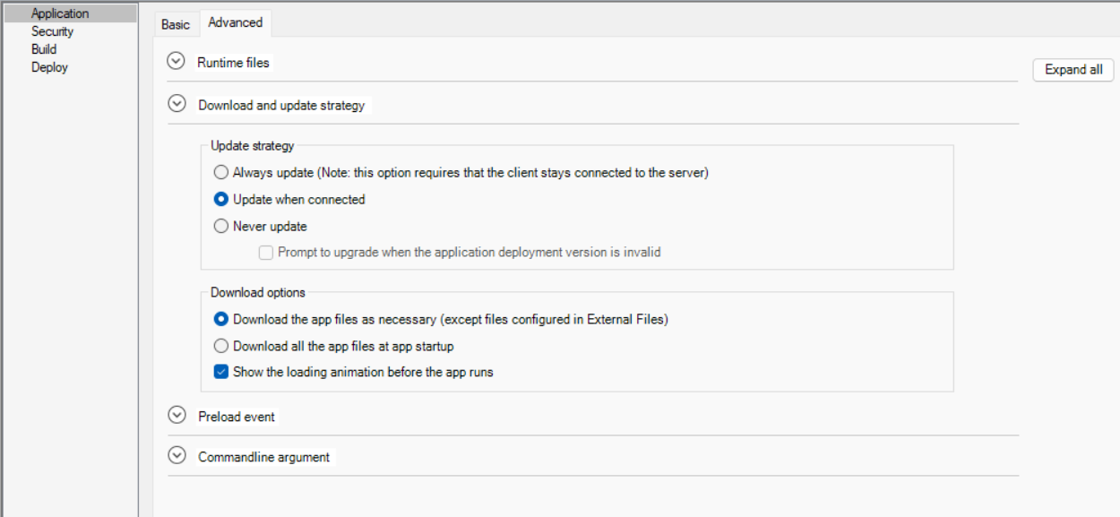 Specify the command line arguments for the application. The arguments will be directly passed to the application when the application is run. The arguments will be automatically saved and updated to the app startup icon on the desktop and the app shortcut menu in Windows start. The arguments specified here are static and cannot be modified at runtime. If you want to pass the argument dynamically at runtime, you can specify the argument in the application URL (for example, http://localhost/salesdemo/?arg=1). But note that the arguments appended to the application URL cannot contain special characters such as "?", "#", as they have special meanings in HTML URL; if you want to use these characters in the argument name or value, you can specify them in Commandline argument as static arguments, so that they can be passed to the application directly instead of being sent as part of the URL. You can also pass arguments to the EXE directly. If there are multiple arguments, please include them in quotation marks or separate them with a delimiter (instead of a space), for example, C:\Users\<username>\AppData\Local\PBApps\Applications\localhost_<appname>\<appname>.exe "parm1 parm2 parm3" C:\Users\<username>\AppData\Local\PBApps\Applications\localhost_<appname>\<appname>.exe parm1/parm2/parm3 If the commandline argument is specified on the client, in the URL or desktop shortcut, and if you want to save the argument in pbapp.ini for future access, you can select the "Save the argument(s) in the pbapp.ini file for future access" option. By default, the arguments will not be saved to the pbapp.ini file. |