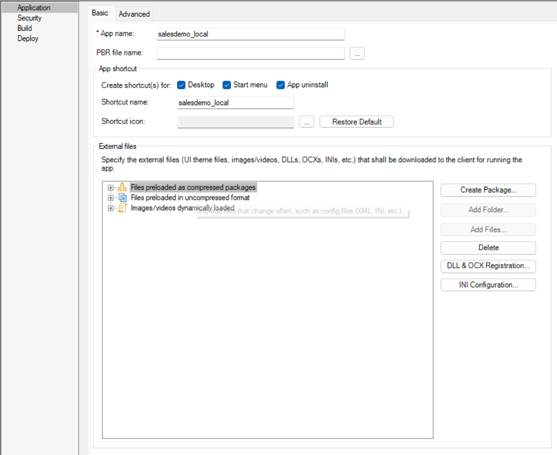 Files preloaded as compressed packages and Files preloaded in uncompressed format The custom user external files will be downloaded from the server before the application starts. It is recommended that you deploy the files which are large or stay unchanged most of the time (such as UI theme files) as one compressed package, so that it can be transferred faster; and deploy the files which may be modified (hence downloaded) frequently as individual files (such as INI files), or deploy them as a separate package because they need to be downloaded frequently.