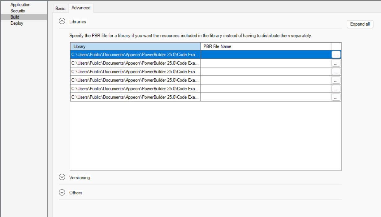 (Optional) Specify a PowerBuilder resource file (PBR) for your application if you dynamically reference resources (such as bitmaps and icons) in your scripts and you want the resources included in the application instead of having to distribute the resources separately. You can type the name of a PBR file in the box or click the button next to the box to browse your directories for the PBR file you want to include. The PBR file as well as the resources it references must reside in the application directory or subdirectory; and only relative paths of the PBR file and the resources will be accepted. For more about PBRs, see Distributing_resources. |