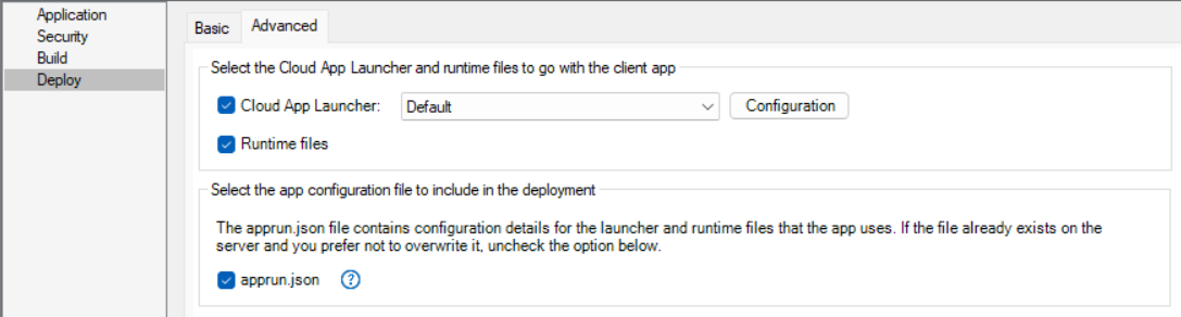 Select whether to deploy/package the apprun.json file. apprun.json specifies the location of launcher and runtime. It is used by the client app to download the launcher and runtime. {