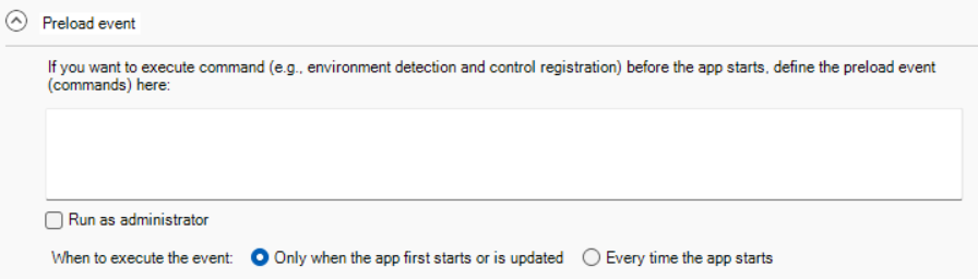 (Optional) Specify the commands that will be executed immediately after files are downloaded and before the application starts. For example, you can specify commands to register DLL/OCX files that cannot be registered by Regsrv32 or Regasm or require administrator rights to register; or any other commands that need to be executed with administrator rights. For another example, if your application contains .NET DLLs which have dependencies on the .NET runtime, you can also create a batch file to check and install the .NET runtime on the client and then assign the batch file in the preload event. If the commands need to be executed with the administrator rights, you should select the Run as administrator option. You can specify how often the commands should be executed: if you select "Only when the app first starts or is updated", the commands will be executed for only one time when the application is launched for the first time or when the application is updated; if you select "Every time the app starts", the commands will be executed every time when the application runs. The commands can be any Windows commands or user-defined commands. For example, suppose there is a DLL file from the application that needs to be registered on the client, you can enter the following commands: cd /d "C:\Windows\Microsoft.NET\Framework\v4.0.30319" regasm "%AppData%\Appeon\PBCloud\demo.appeon.com_app1\EncryptDecryptClass.dll" /tlb:testappeon.tlb /codebase /nologo Note: As the commands are executed silently, any commands that will pause the execution and wait for user input will cause the application to wait endlessly. |