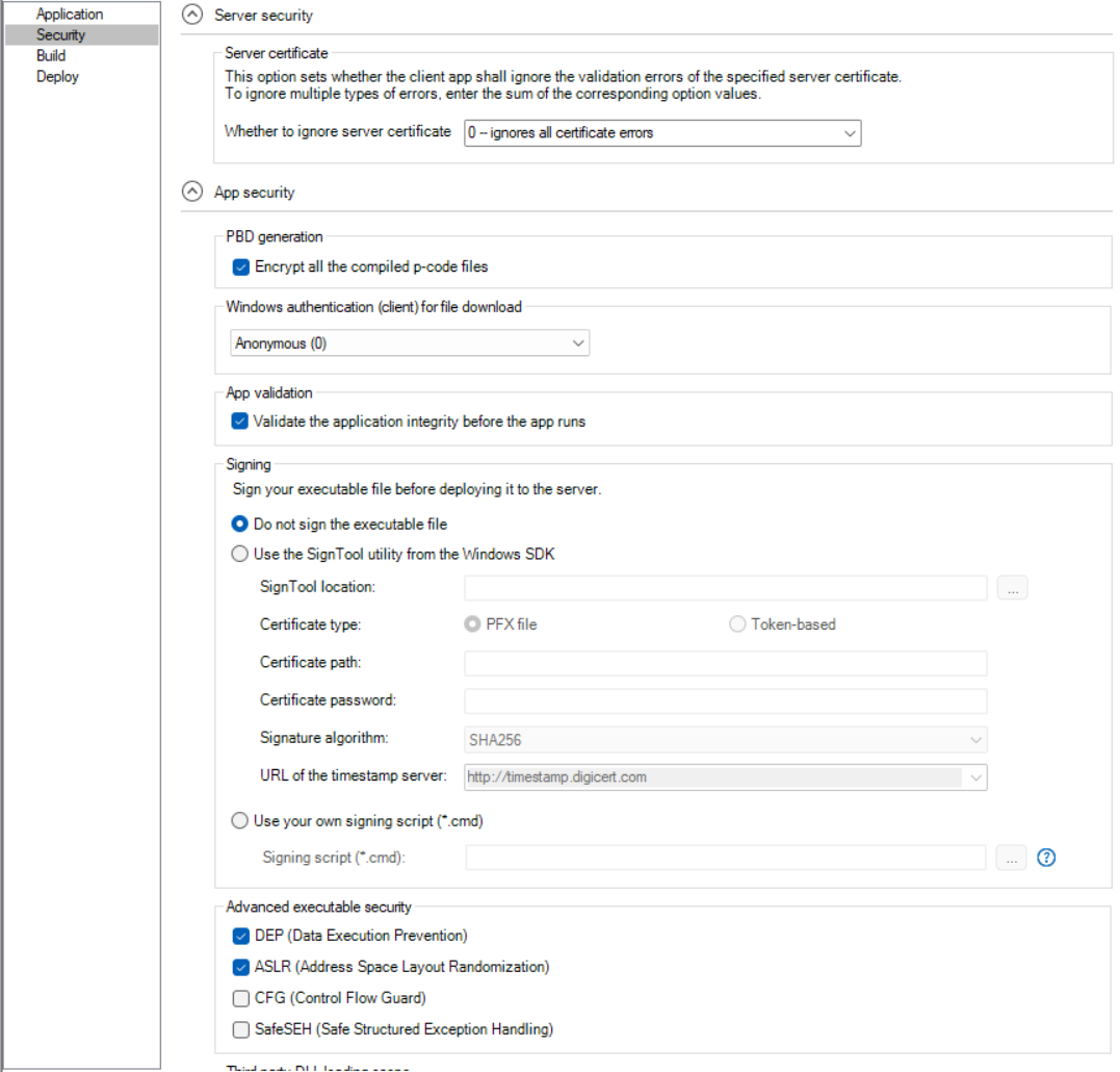 Select the desired security flags for the application executable file (appname.exe). PowerBuilder Runtime files will support these security flags in the future release. These flags allow PowerBuilder applications to leverage modern Windows executable security features.