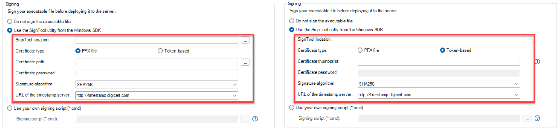 Select whether to digitally sign the application executable file (appname.exe). You can sign the file using a PFX file or a token. (To sign with an HSM (Hardware Security Module), you can only use the "Use your own signing script" option.) To use the "Use the SignTool utility from the Windows SDK" option to sign the application executable file: