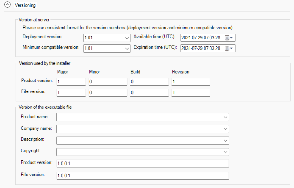 Available time -- Schedule the time for the deployment version to be accessible to end users. Expiration time -- Schedule the time for the deployment version to be inaccessible to end users. If the available time or expiration time is reached and the app is still open, the app will not get updated, until the app is closed or the session times out. Therefore, it is recommended that the session timeout feature should be enabled (for apps deployed via PowerServer) or implemented (for apps deployed via PowerClient). Version used by the installer > Product version -- Specify the product version (in numeric values) that will be used by Microsoft Installer to determine whether a product needs to be updated. Version used by the installer > File version -- Specify the file version (in numeric values) that will be used by Microsoft Installer to determine whether a file needs to be updated. Product name, Company name, Description, Copyright, Product version, File version -- Specify your own values for these fields associated with the application file and with machine-code DLLs. These values become part of the Version resource associated with the application file, and most of them display on the Version tab page of the Properties dialog box for the file in Windows Explorer. The Product and File version string fields can have any format. The four numbers can be used to represent the major version, minor version, point release, and build number of your product. They must all be present. If your file versioning system does not use all these components, you can replace the unused numbers with zeros. The maximum value for any of the numbers is 65535. |