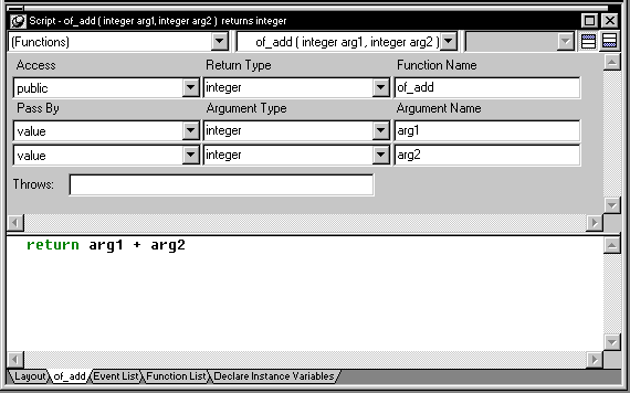 When you add a new function, a Prototype window displays above the script area in the Script editor. The fields in the Prototype window are in the same order as the function's signature: