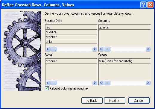 After you have specified the data for the crosstab's columns, rows, and values, PowerBuilder displays the crosstab definition in the Design view.