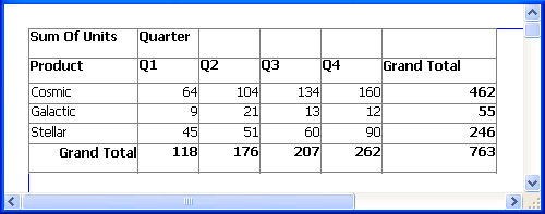 Because sum(units for crosstab) was selected as the Values definition, each cell contains the total unit sales for the corresponding quarter (the Columns definition) and product (the Rows definition).