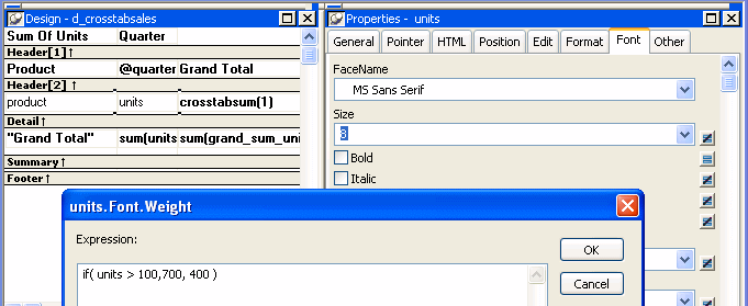As with other DataWindow objects, you can specify property conditional expressions to modify properties at runtime. You can use them with either dynamic or static crosstabs. With dynamic crosstabs, you specify an expression once for a column or value, and PowerBuilder assigns the appropriate properties when it builds the individual columns at runtime. With static crosstabs, you have to specify an expression for each individual column or value, because the columns are already specified at definition time.