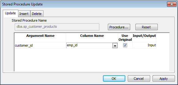 Select the tab for the SQL update method (Delete, Insert, or Update) with which you want to associate a stored procedure.