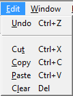 For example, in the following menu all menu items have accelerator keys: the accelerator key is U for Undo, T for Cut, and so on. New, Undo, Cut, Copy, Paste, and Clear each have shortcut keys: the Ctrl key in combination with another key or keys.