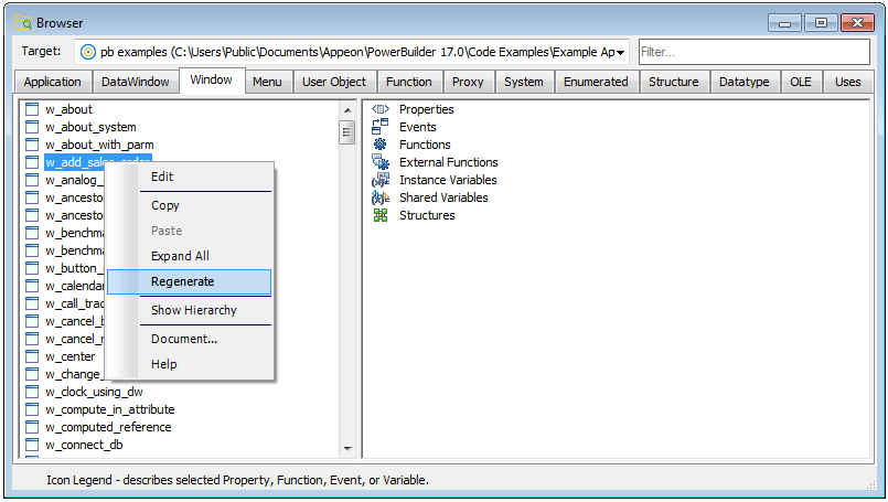 For example, if you want to regenerate all descendants of window w_frame, click the Window tab.