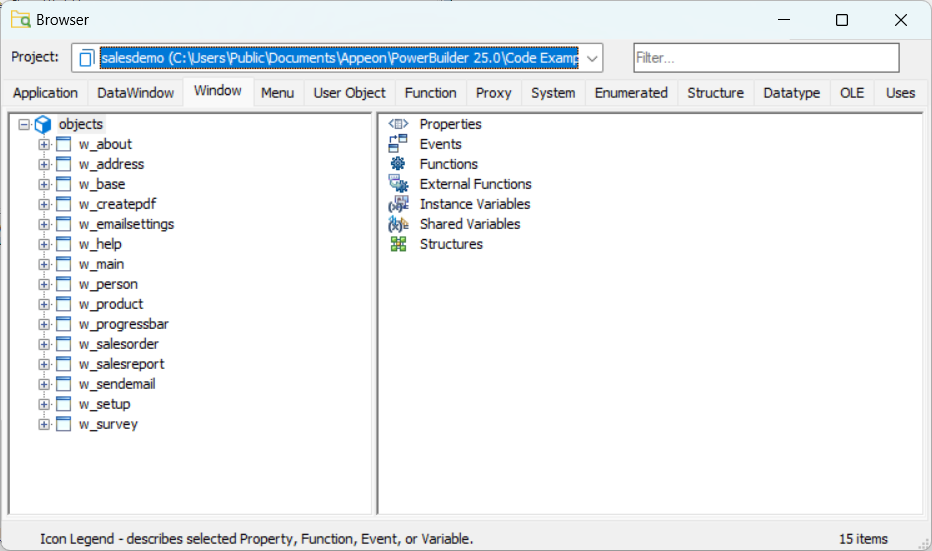 The left pane displays a single type of object, such as a window or menu. The right pane displays the properties, events, functions, external functions, instance variables, shared variables, and structures associated with the object.