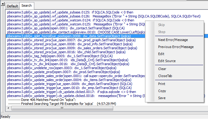 When appropriate, lines in the Output window provide links that invoke the correct painter when you double-click on that line. The pop-up menu also provides the options Edit and Edit Source to open an object in a painter or the Source editor. You can copy the contents of the current tab to the Windows clipboard, save its contents to a text file, or print its contents to your default printer.