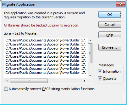 The Migrate Application dialog box lists each PBL that will be upgraded and lets you choose the type of messages that display during the migration process.