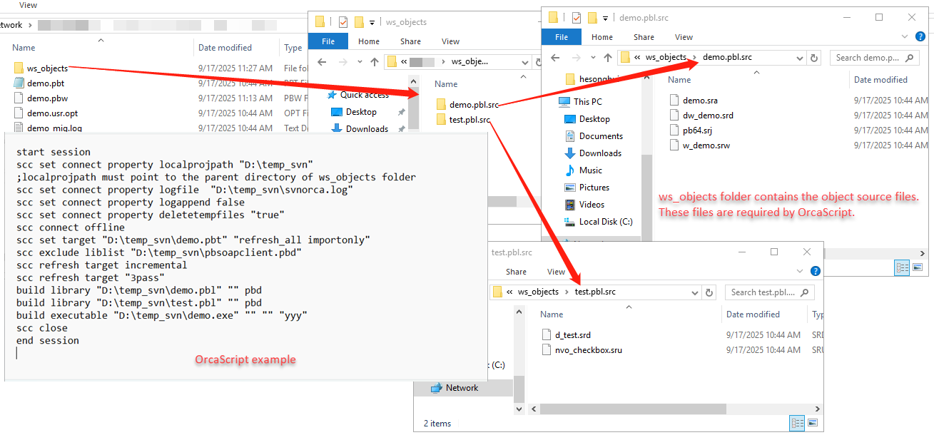 start session scc set connect property localprojpath "D:\temp_svn" ;localprojpath must point to the parent directory of ws_objects folder scc set connect property logfile "D:\temp_svn\svnorca.log" scc set connect property logappend false scc set connect property deletetempfiles "true" scc connect offline scc set target "D:\temp_svn\demo.pbt" "refresh_all importonly" scc exclude liblist "D:\temp_svn\pbsoapclient.pbd" scc refresh target incremental scc refresh target "3pass" build library "D:\temp_svn\demo.pbl" "" pbd build library "D:\temp_svn\test.pbl" "" pbd build executable "D:\temp_svn\demo.exe" "" "" "yyy" scc close end session